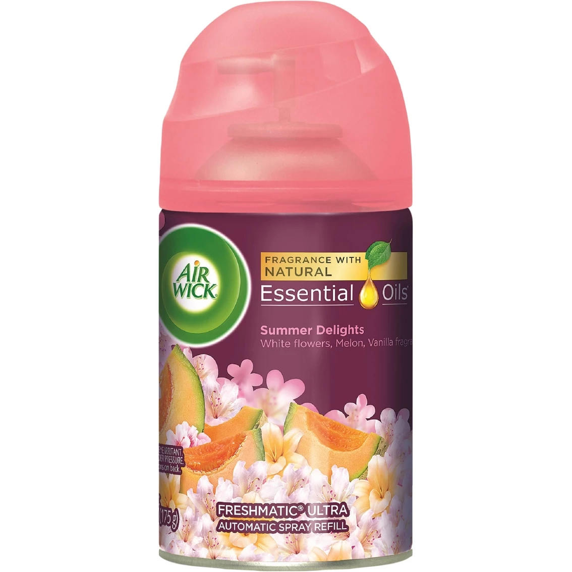 Fill your home with continuous fresh fragrance with the Air Wick Ultra Freshmatic Life Scents Automatic Spray Air Freshener refill. This playful and fun Summer Delights multi-layered fragrance brings the delights of summer into your home, combining fresh white floral, sweet melon and subtle vanilla. It neutralizes odors and fragrances your home. Just set it to your preferred fragrance level and enjoy the continuous freshness in your bedroom, bathroom, living room, office or den. Model: 91101.