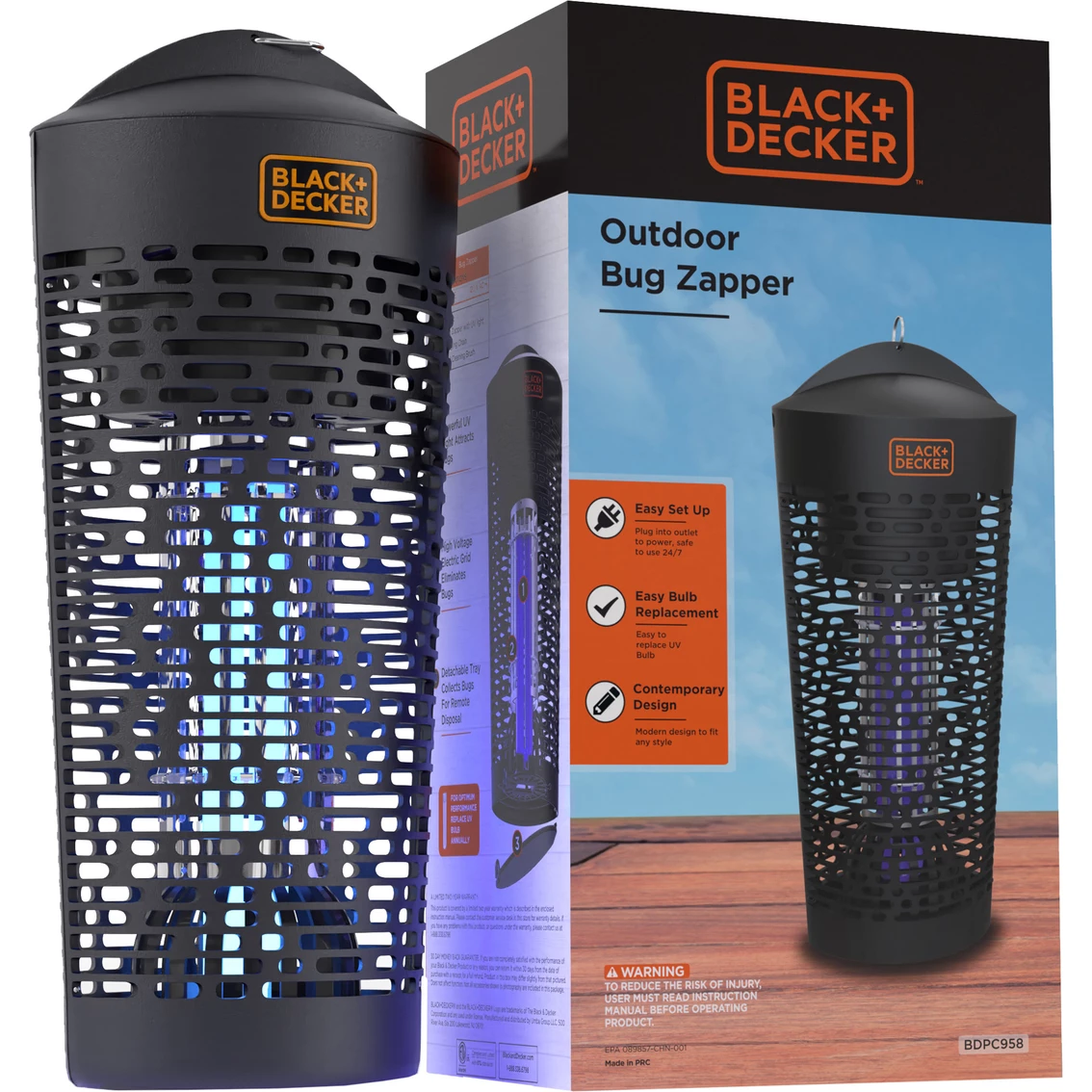 Banish bugs once and for all. Whether you’re dealing with biting backyard insects or persistent house flies, this electric Bug Zapper from Black & Decker provides fast, reliable pest control with maximum coverage of up to one acre. The lantern’s long-lasting UV light emits a powerful glow-gentle to the eye, but tough on pesky bugs. Hang it up high, relax and enjoy your indoor or outdoor space while the machine works its zapping magic. Once the party is over, pull out the collection tray, empty it into the garbage, and use the provided brush to restore the grid to a pristine clean. Designed for optimal safety and energy efficiency, the high-powered killer can also withstand rain, wind and most non-severe weather conditions. Great for backyard BBQ, camping, patios, garage, deck or picnic area. Model: BDPC958.