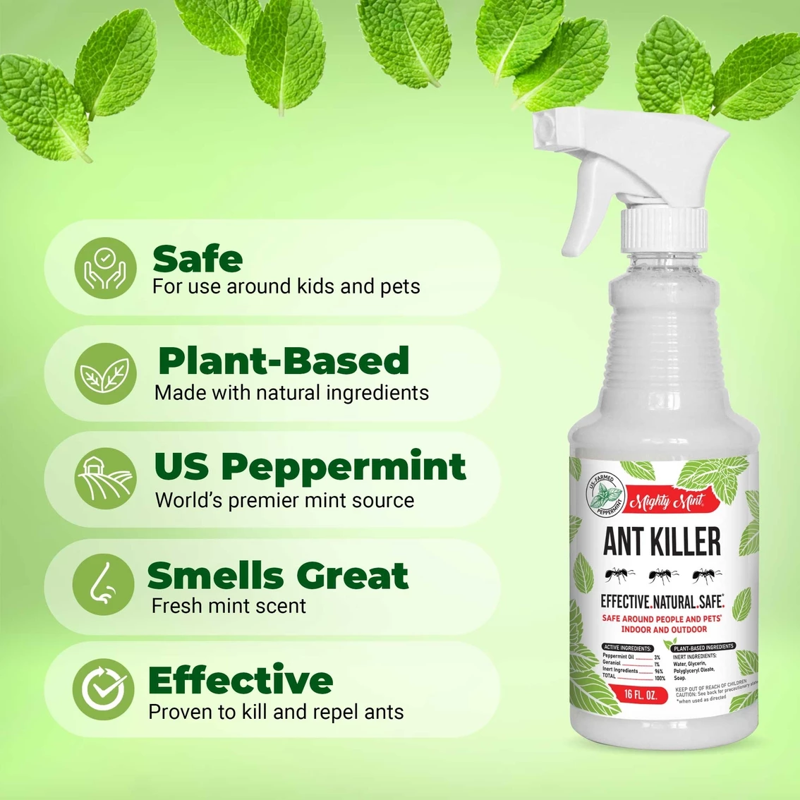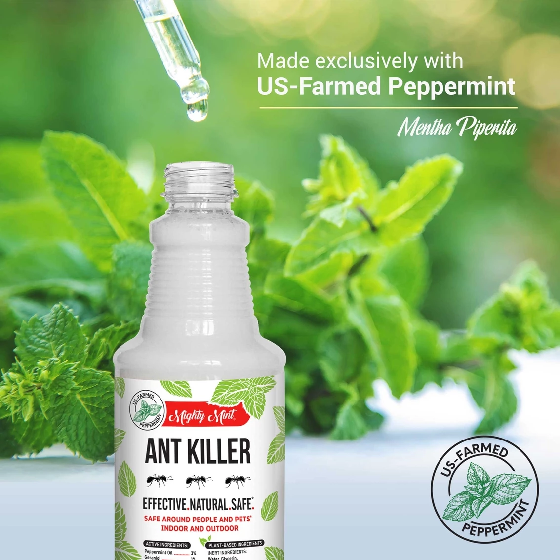 Mighty Mint Ant Killer from Pure Origins is a high-strength, plant-based spray created to kill and repel ants without compromising on safety. This spray is made with natural peppermint oil and is effective on most common ant types, including sugar ants, fire ants, carpenter ants, and more. Shake well before use. Spray ants directly for contact kill. To use as a repellent, spray problem areas such as baseboards, cracks, and known entrances to keep ants away. For best results, spray till the surface is covered and repeat the process twice per week. Though ingredients are plant-based and will not damage most surfaces, test before applying broadly.