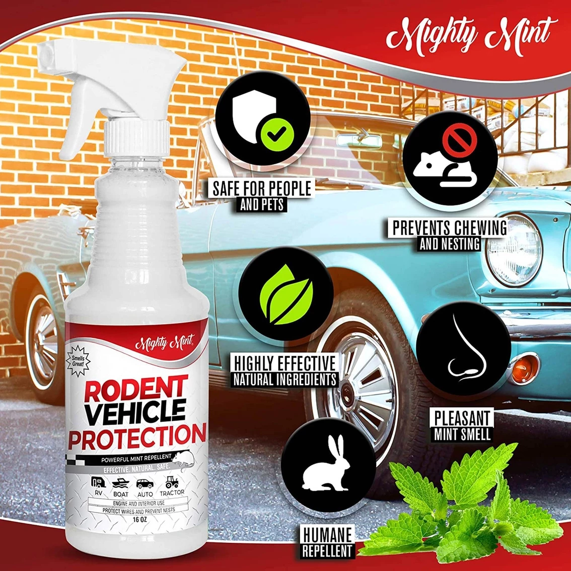 Directions for use: Liberally spray problem areas such as your vehicle’s interior or engine compartments to keep rodents from entering or nesting. For best results, spray until the surface is covered and repeat the process regularly.