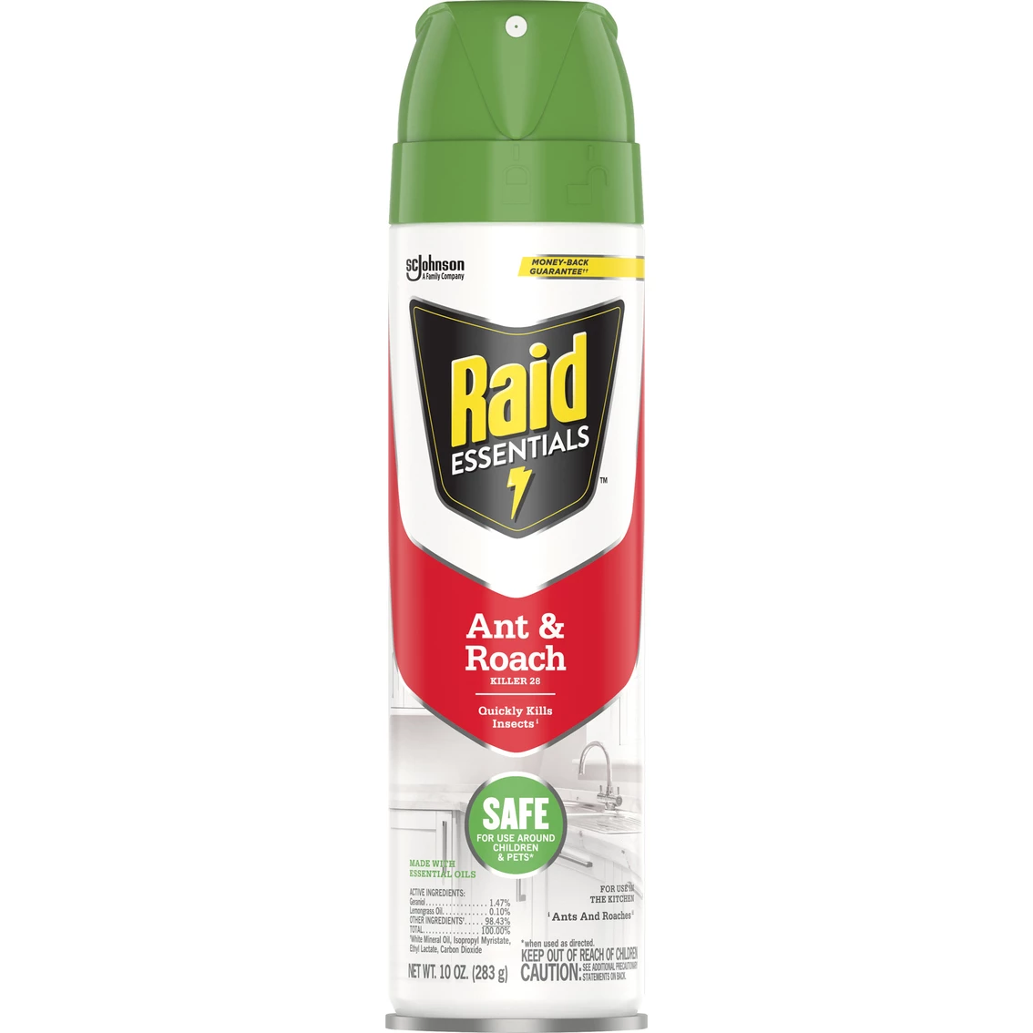 Raid Ant and Roach Killer Spray with Essential Oils is specially formulated to quickly kill ants, roaches and over 20 household pests while being safe to use around kids and house pets. It is made with lemongrass extract, geraniol synthesized from pine trees. For maximum efficiency, spray insects directly at approximately 18 in. from interior walls, fabrics and furniture.